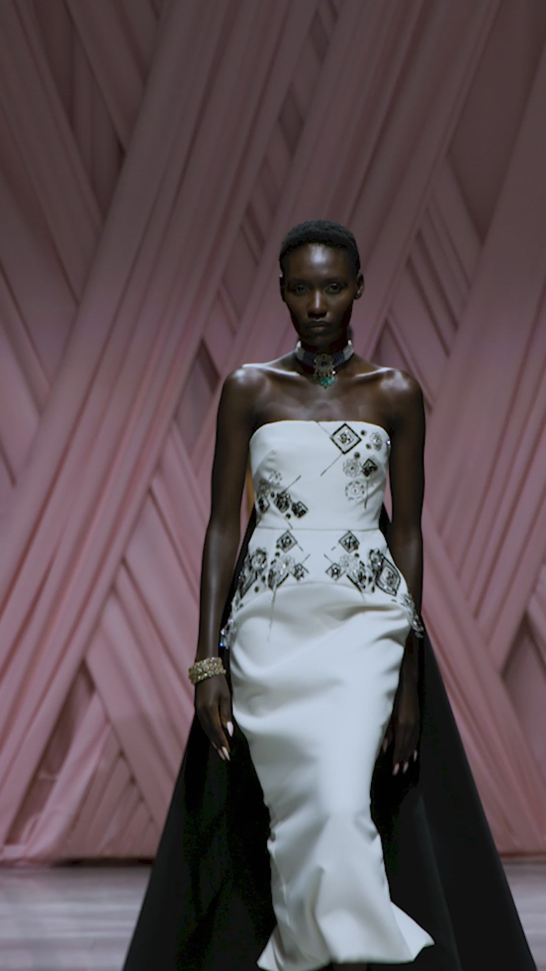 An alabaster cady dress featuring Alpana embroidery and a dramatic onyx train. The straight silhouette is clean and minimal, contrasted by the bold dark train that extends from the back. Embroidery adds refined detail to the smooth cady fabric.