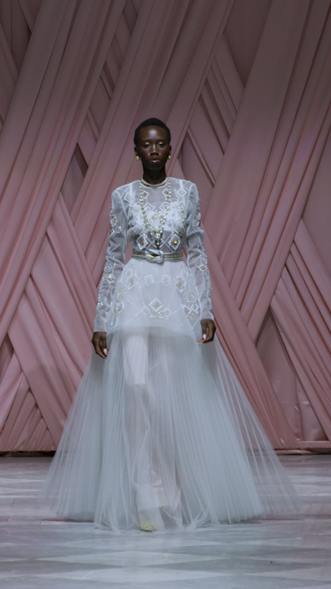 An ivory gown in layered tulle and embroidered with Alpana motifs. The fitted bodice extends into a pleated skirt that flows softly to the floor. A peplum-style train adds extra volume and structure to the silhouette.