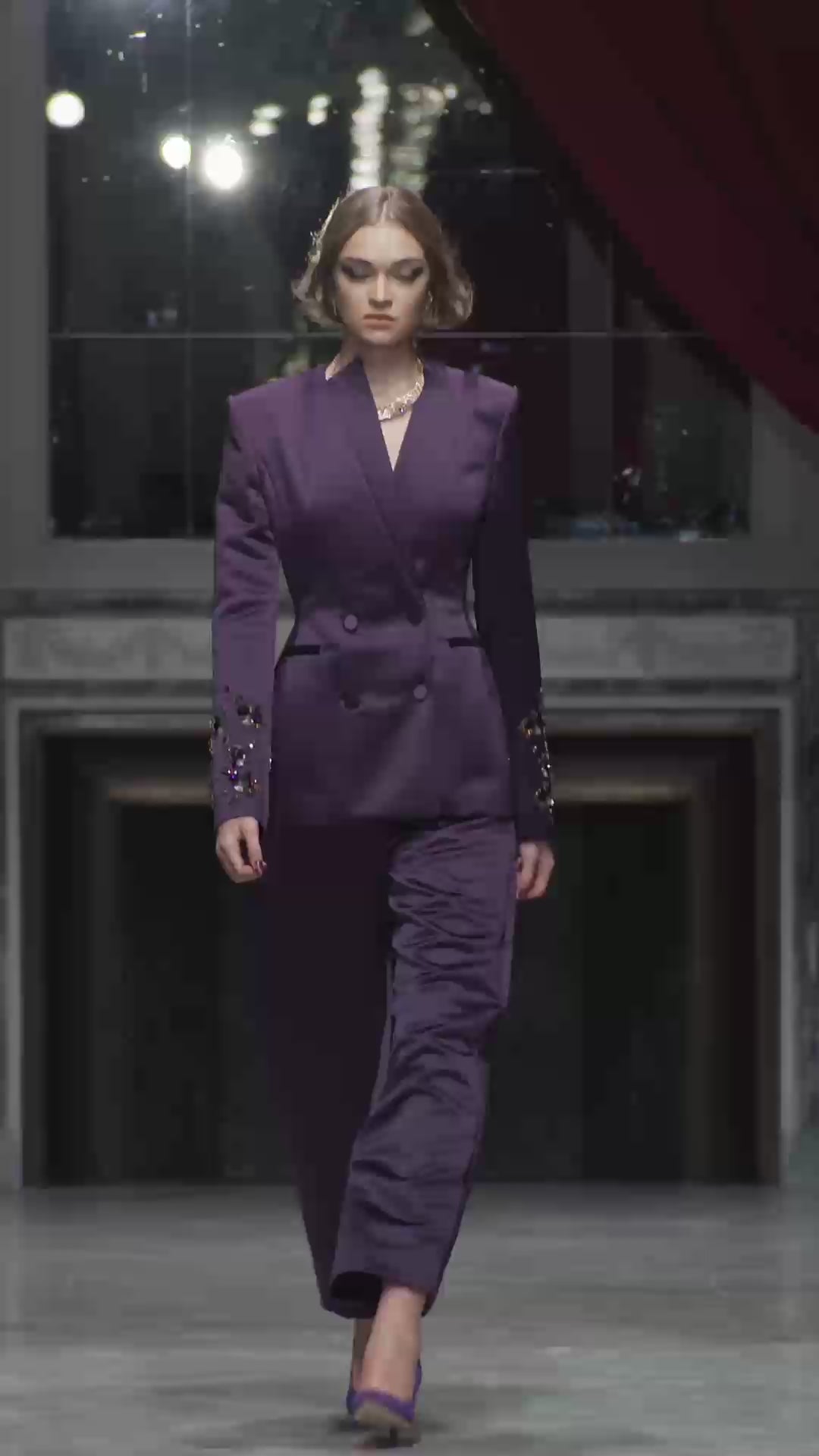 Tailored trousers made from amethyst double duchess satin feature a clean, straight leg and a high waist that elongates the silhouette. The structured satin maintains its elegant shape, with a crisp crease and a rich color. These trousers complete the suit with the same meticulous attention to detail as the jacket.