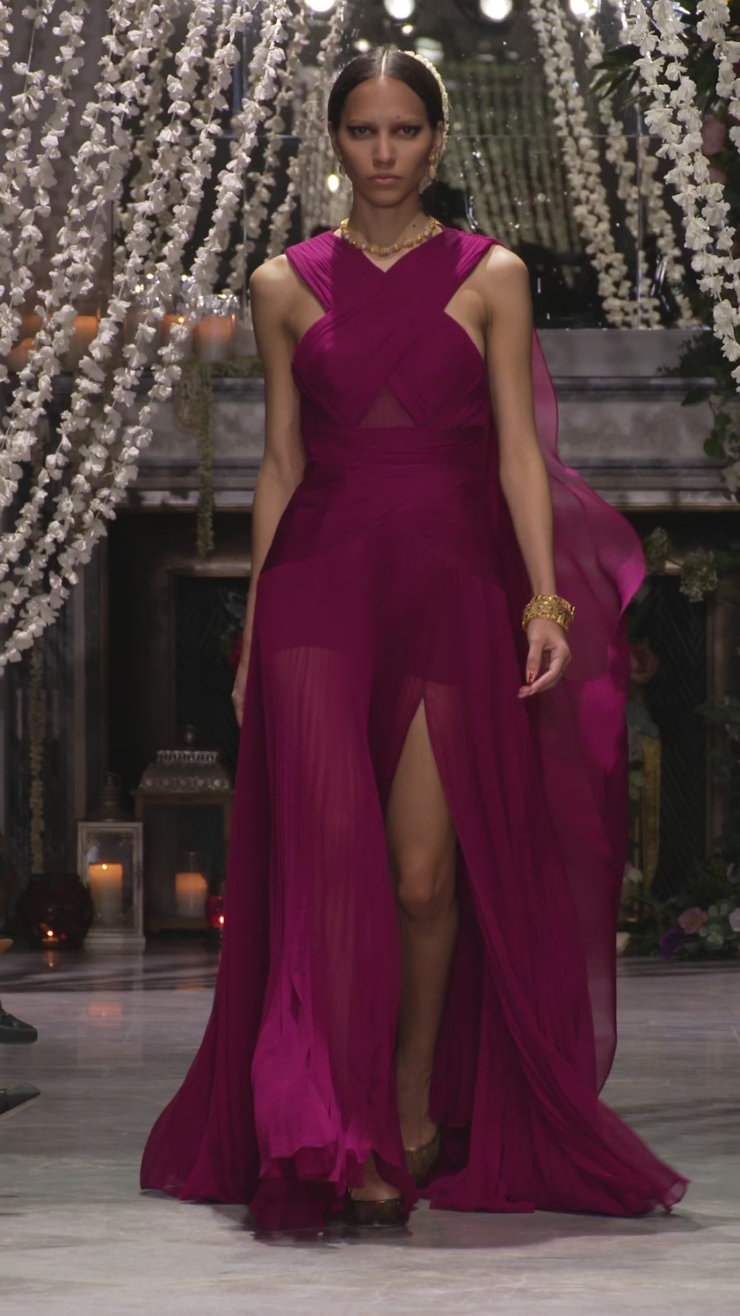 Ethereal floor-length silk chiffon gown in a striking deep magenta hue, designed to captivate with its fluid movement and sheer, pleated chiffon panels. The intricately draped bodice features a crisscross halter neckline, creating a sculpted yet effortless silhouette. High slits and delicate transparency add a bold, modern allure, while the flowing train ensures graceful motion with every step. Perfect for red carpet moments and gala soirées, this gown is a statement of sensuality and elegance.