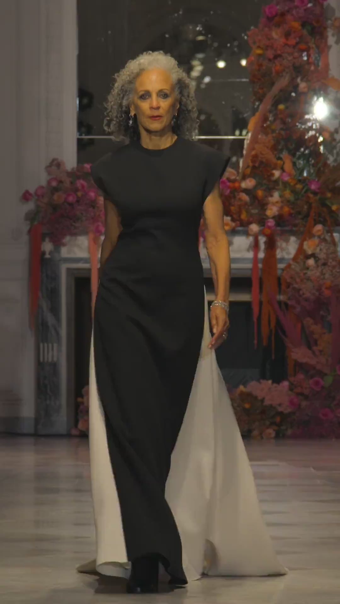 From the front, the dress appears to have a straight silhouette, but a swath of ivory fabric in the back allows the contrasting color to peek through, particularly when the dress is in motion. The skirt has a voluminous effect without the use of excessive fabric. The back features a circular cut-out for a bit of reveal and added design interest.