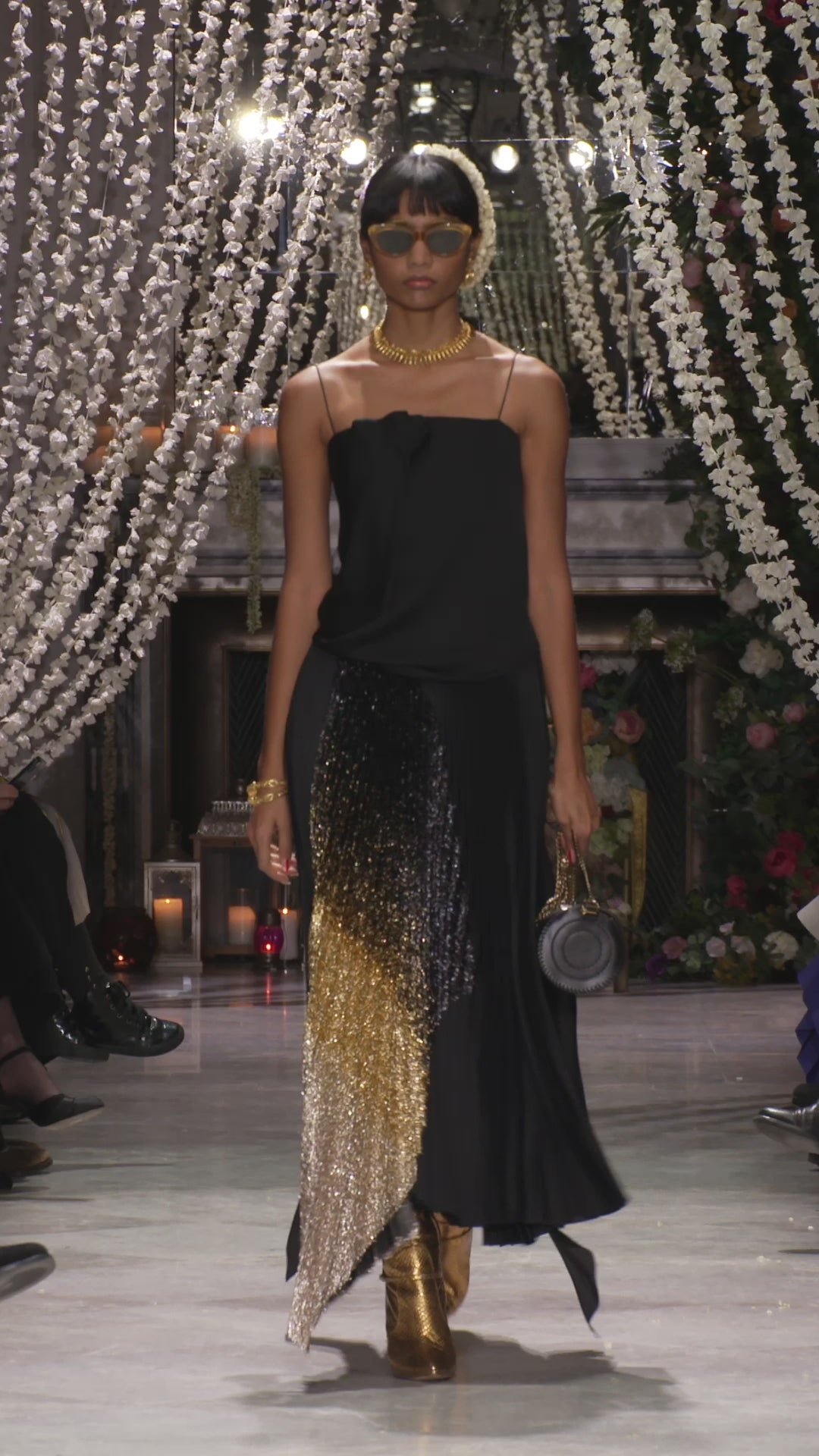 Black Gazar Pleated Skirt with Black/Gold Ombre Lurex Insert