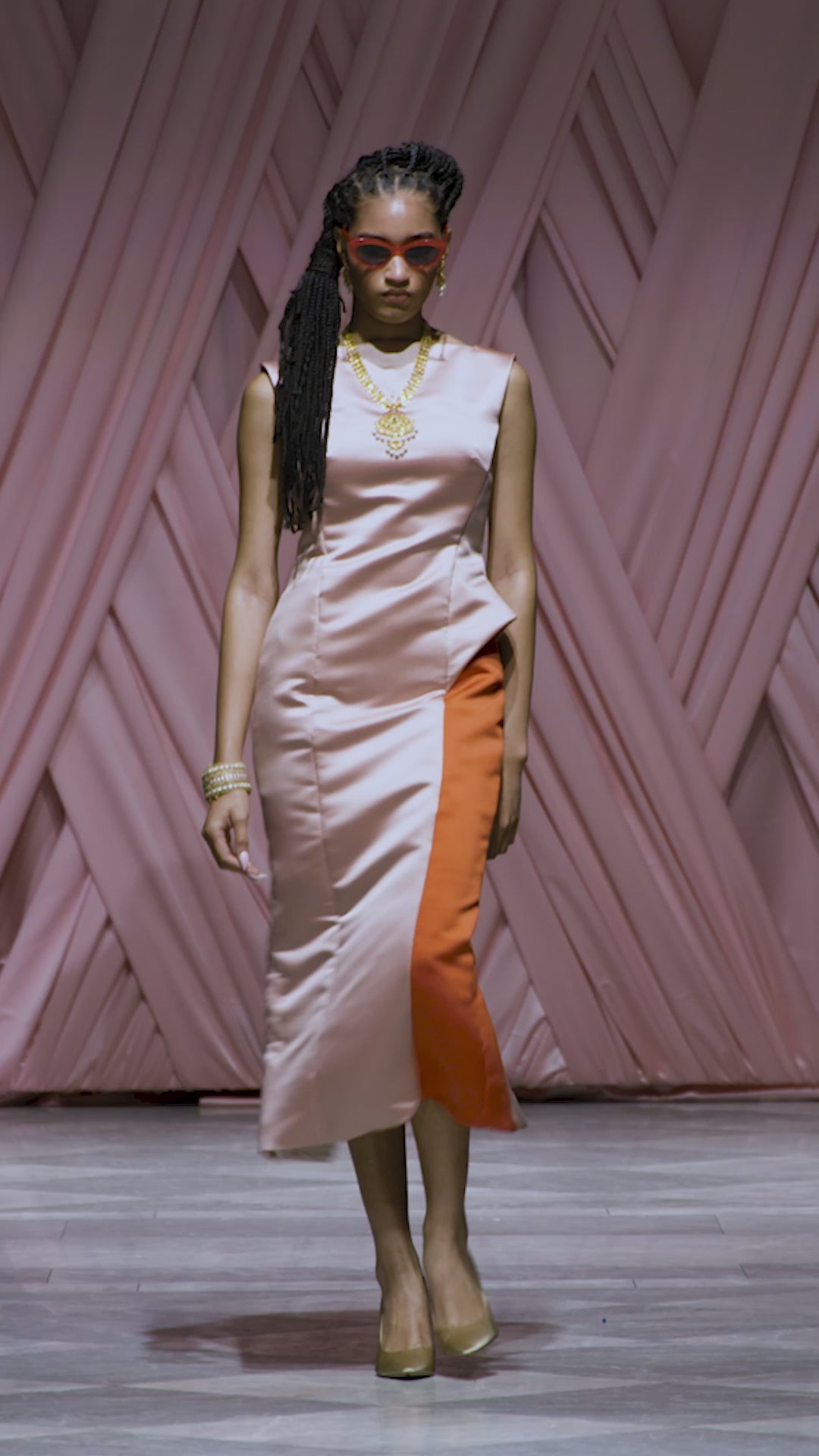 A fitted sheath dress in blossom double face duchess satin, designed with a dramatic canopy peplum at the waist. The structured peplum adds volume to the clean silhouette, creating a bold yet elegant finish.