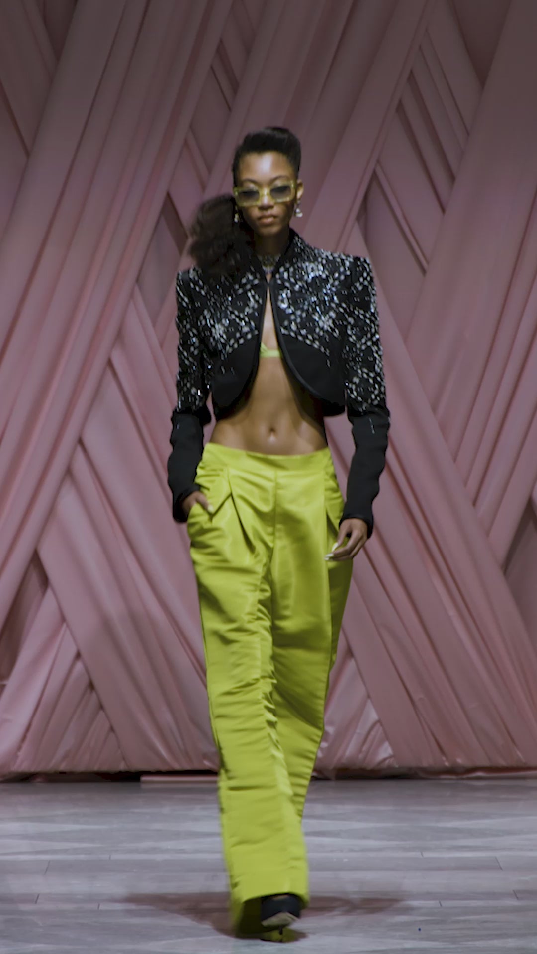 Wide-leg chartreuse faille trousers, the look contrasts dark embroidery with vibrant color.