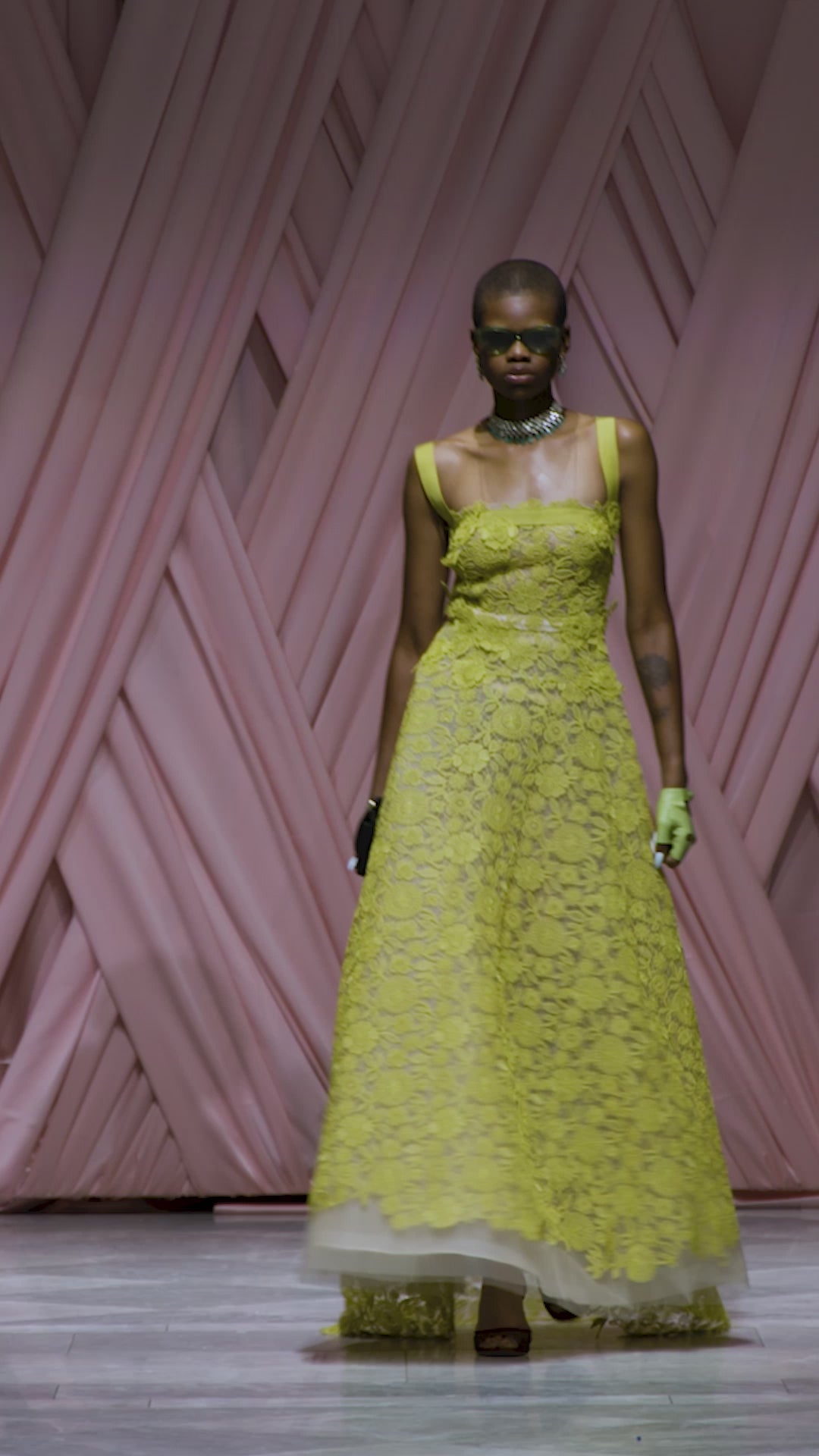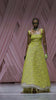 A chartreuse gown crafted in Smita lace. The fitted silhouette is paired with harness-style straps and detailing that frame the bodice. The intricate lace fabric contrasts with the bold harness design, giving the gown a modern edge.