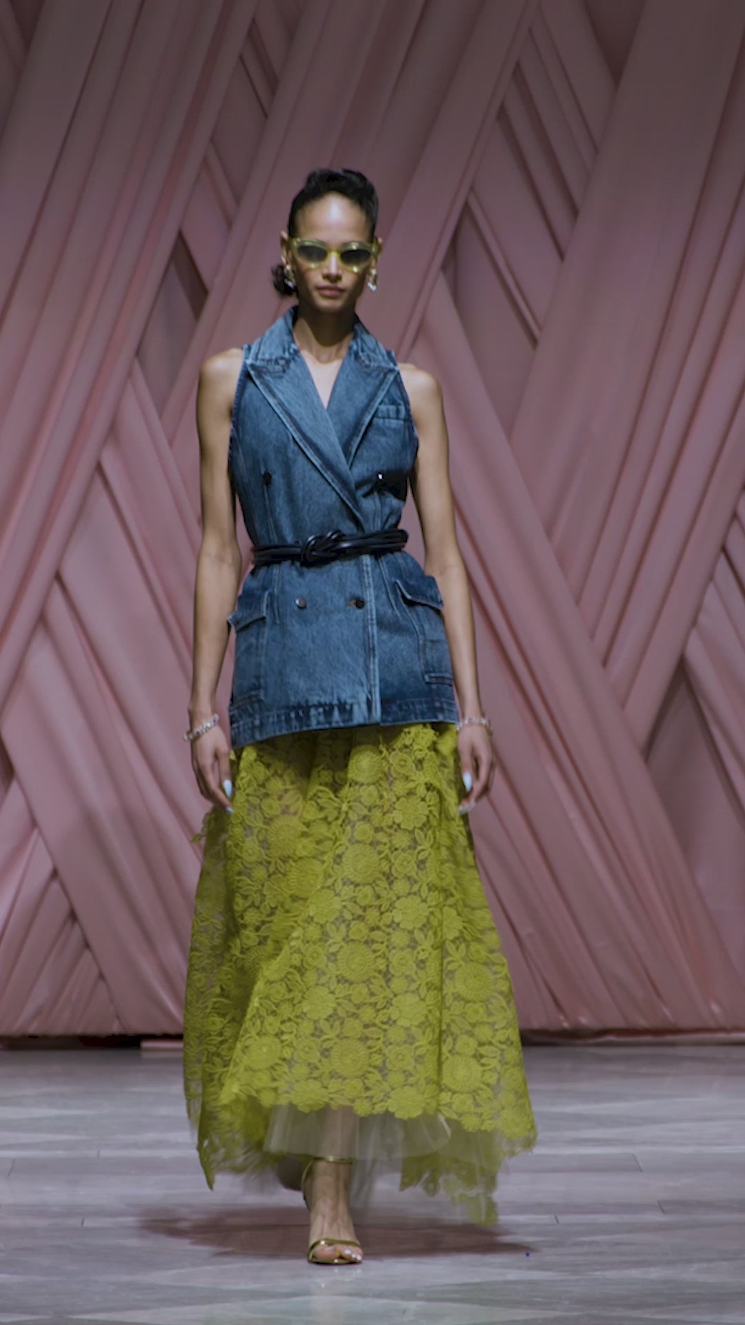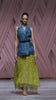 A chartreuse Smita lace skirt, pair with our tailored double-breasted vest in structured Indira denim, for an ensemble that contrasts the clean lines of denim tailoring with the delicate texture of lace. The bold color and mixed fabrics create a modern balance of structure and femininity.