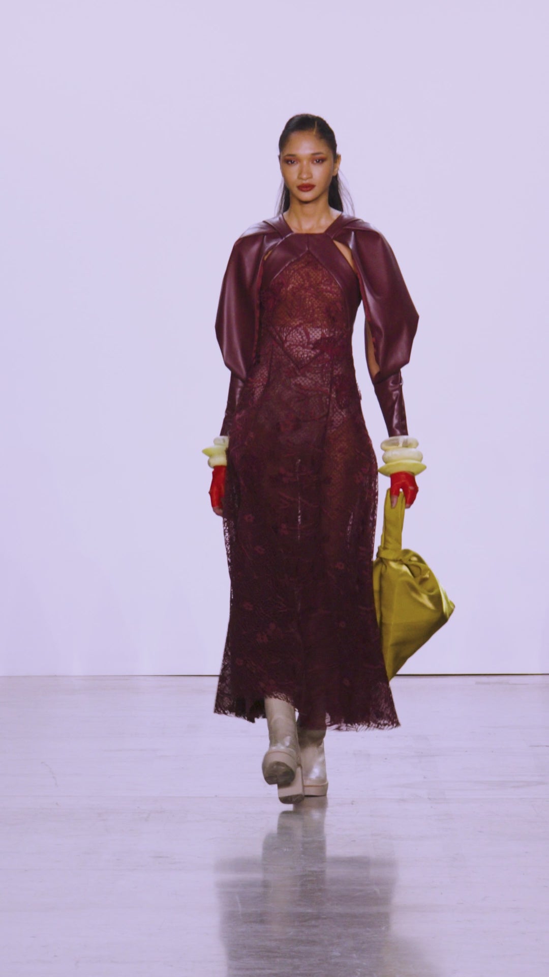 Claret halter neck guipure lace and vegan leather, draped sleeve dress.