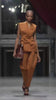 A tailored vest crafted in copper double duchess satin—the richness of the tone amplified by the fabric's smooth, luminous finish. Sharp shoulders, a deep V neckline, and precise button placement define a sculpted, waist-cinching silhouette, while clean seam lines give the piece an architectural exactness that reads as elevated suiting.