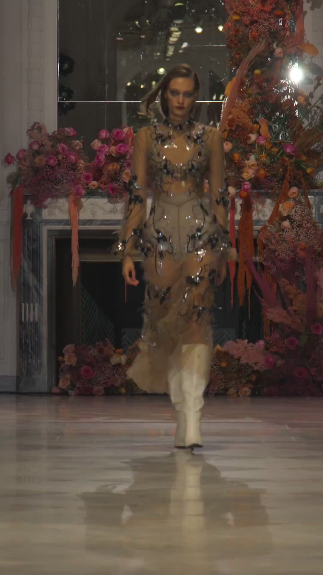 The stunning gown is made of almond-colored tulle without any lining, allowing the petal embroidery to be fully sheer. The waistline features an upward-pointing detail for emphasis, and the garment is decorated with intricate petal embroidery throughout.