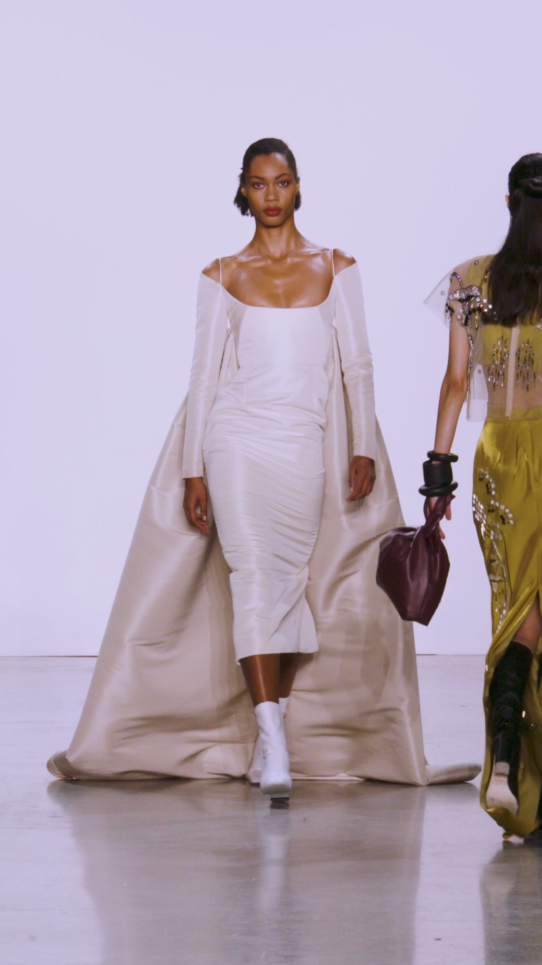 Ivory and Stone Faille Gown with Explosion Cape Drape