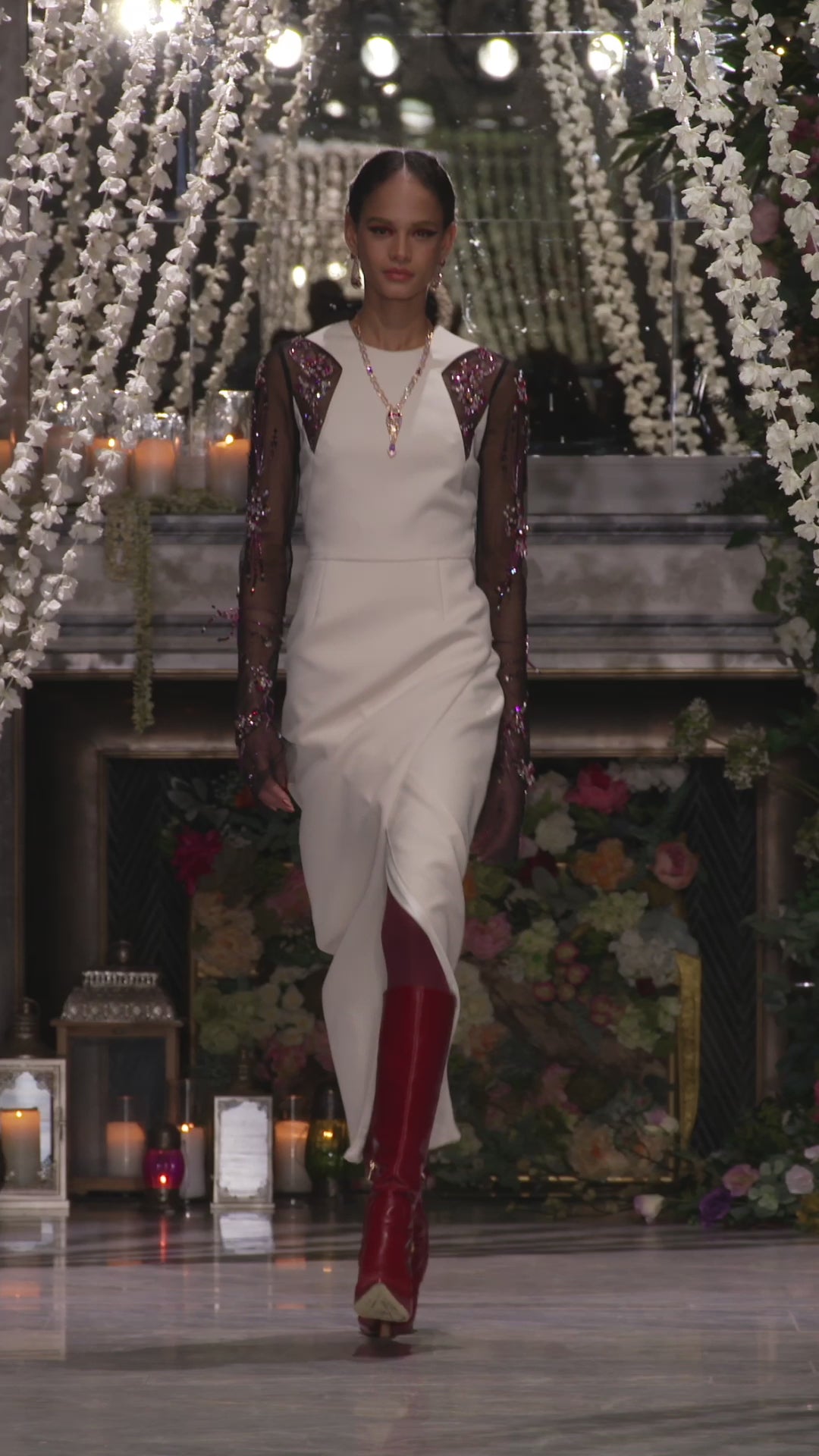 Exquisite ivory cady dress adorned with delicate Preciosa crystals and traditional Jhoti embroidery. Sheer black sleeves provide a striking contrast, with embroidered elements that stand out against the ivory body. The combination of textures and embellishments creates a sophisticated and visually captivating design.