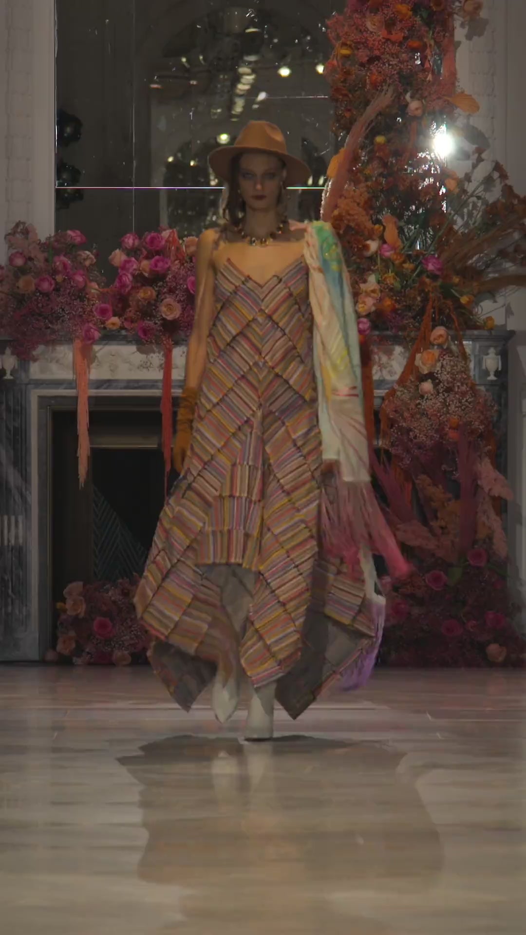 Strips of rainbow-ribbed Mashru fabric are frayed at the ends to create cracked seams in between the chevron pattern from neckline to hemline. The flowy dress features spaghetti straps, a wide V neckline, and a handkerchief hemline.