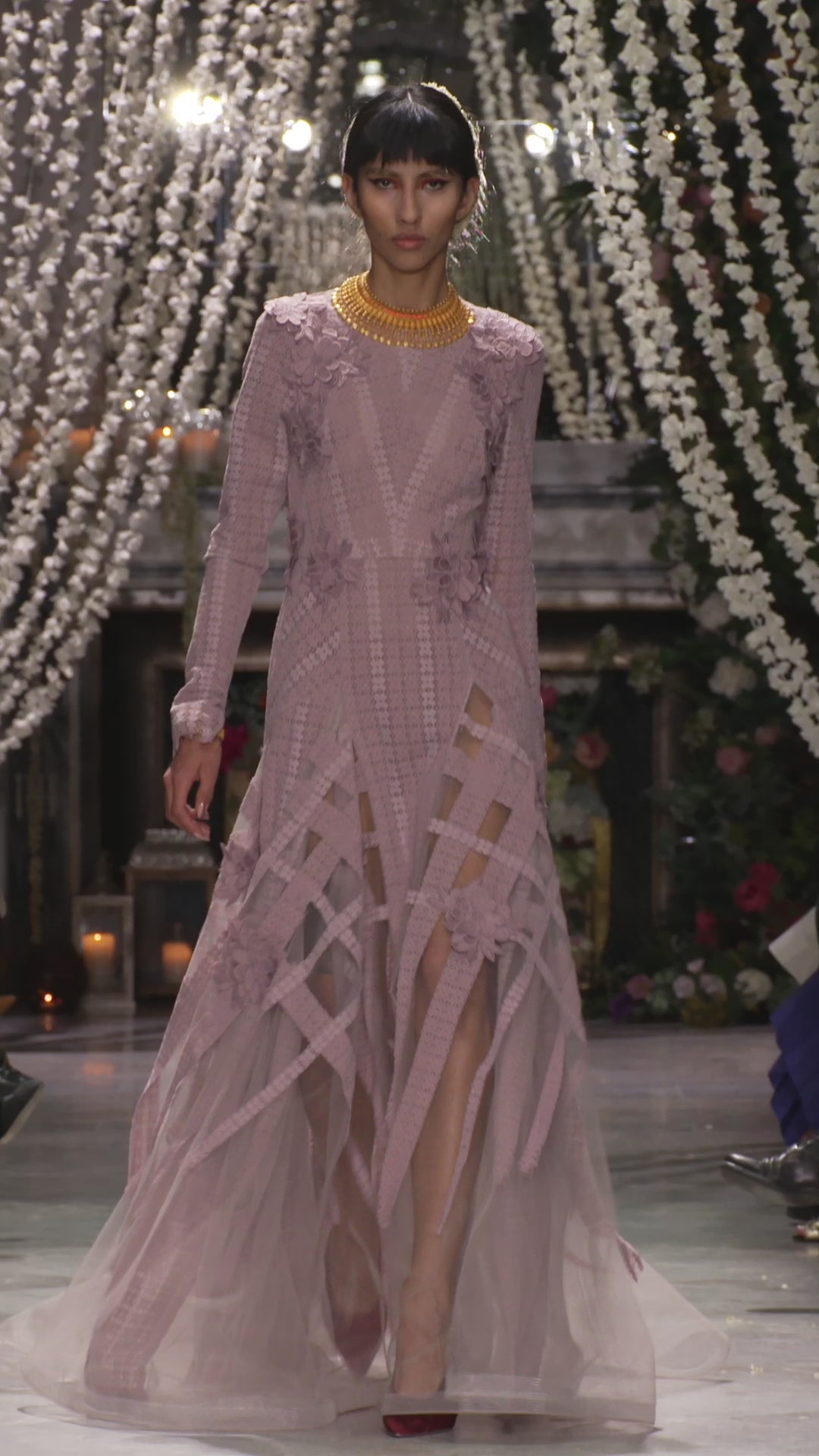Mauve Flocked Lace and Tulle Gown with Floral Appliqué
