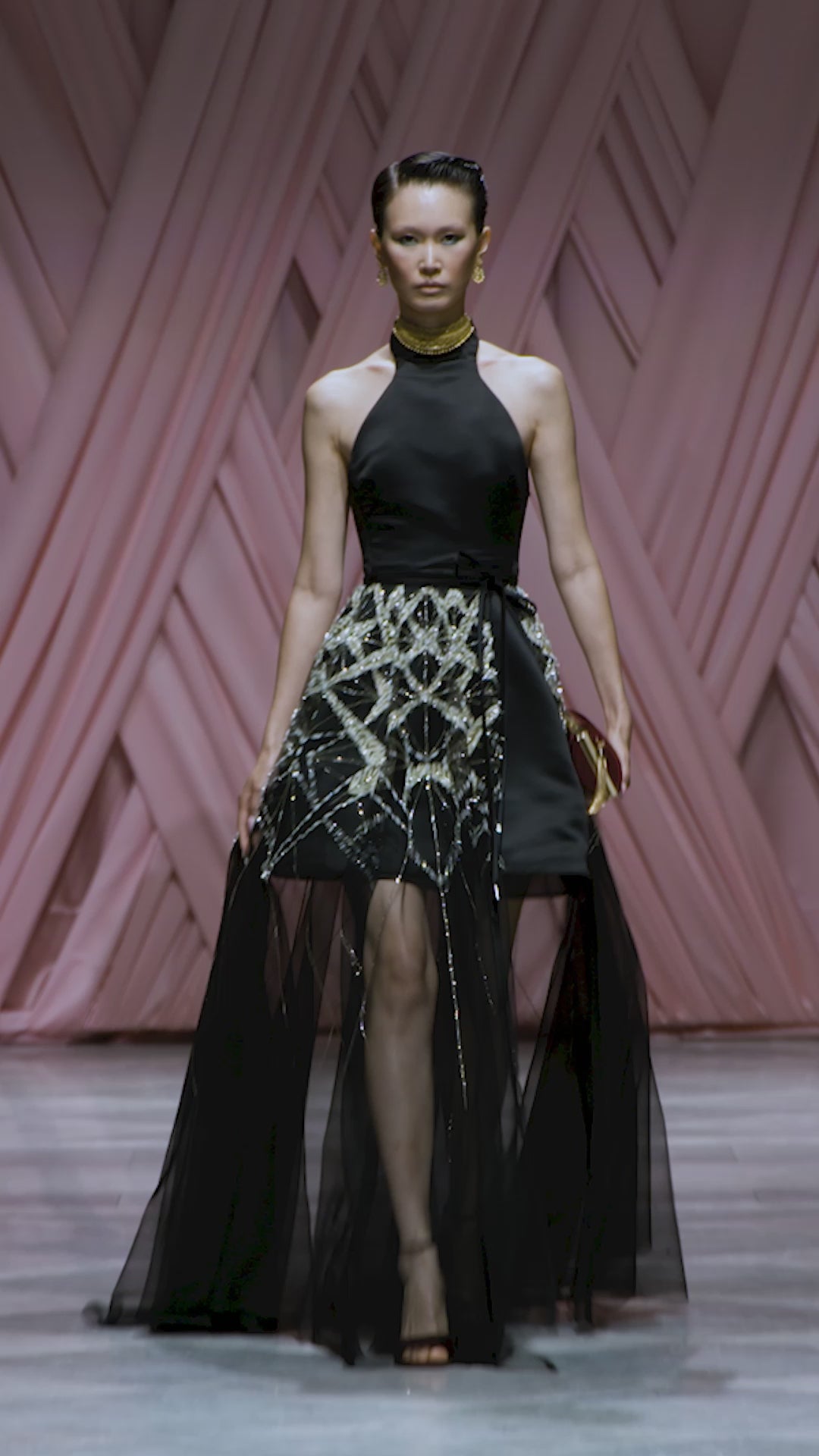 Onyx Double Face Duchess Satin Halter Dress with Bell Skirt and Sitara Embroidered Tulle Pareo
