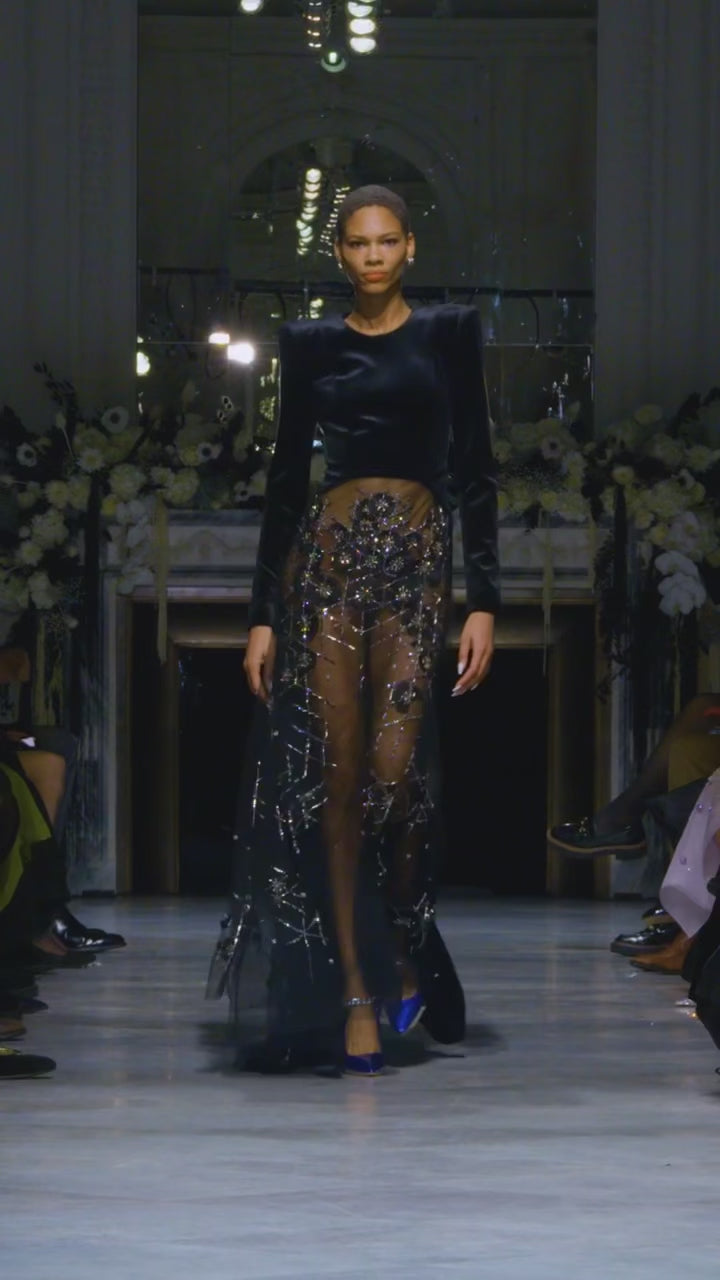 Embrace sensual elegance. Our black velvet and tulle tailcoat gown is adorned with exquisite crystal lattice embroidery. The gown seamlessly melds the traditional craftsmanship of zardozi with the modern flair of a western tailcoat detail, creating a perfect harmony between East and West. The luxurious velvet fabric, combined with delicate tulle accents, adds depth and dimension to the gown, while the intricate crystal lattice embroidery adds luxe refinement. Perfect for black-tie affairs.