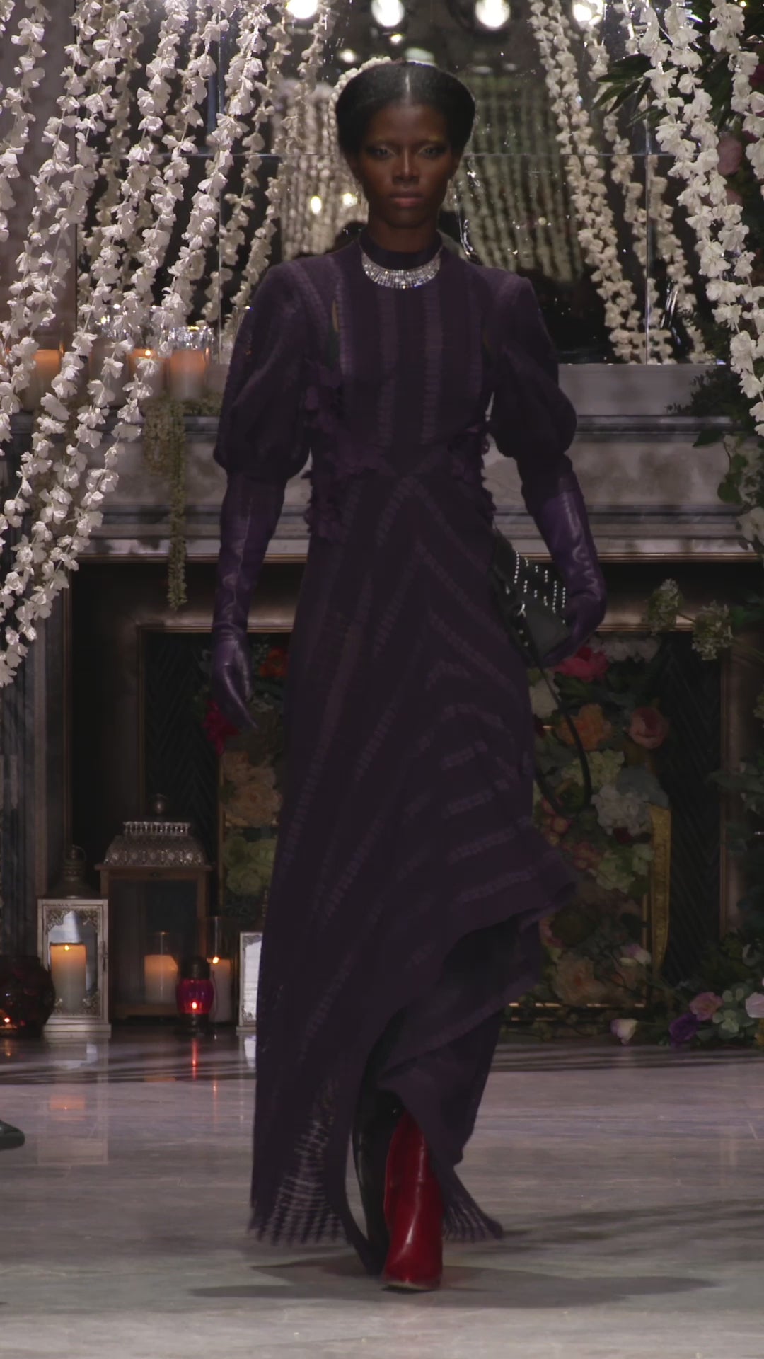 Plum Flocked Lace Dress with Bell Sleeves and Asymmetrical Hem