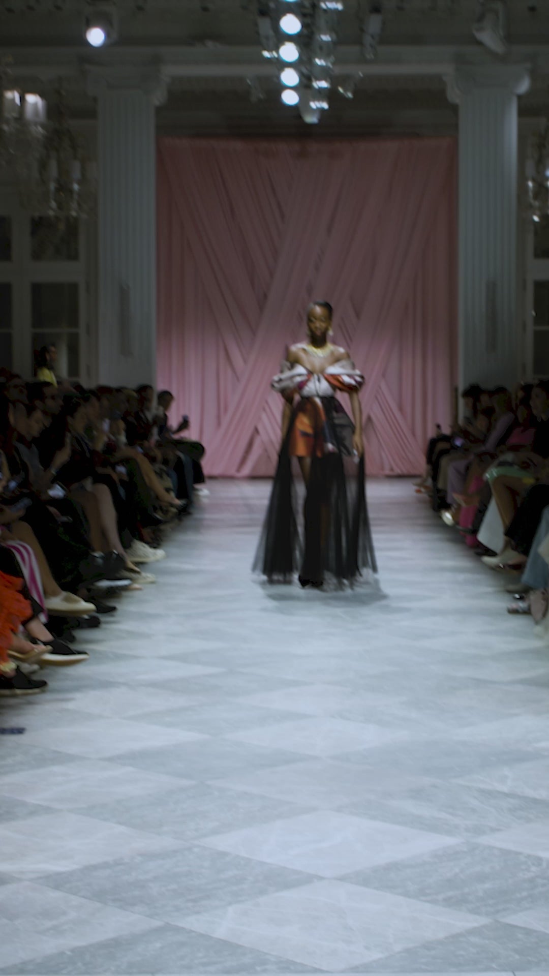 A rose Barathea gown featuring the Lata print. Designed with a full canopy skirt that creates volume and movement, the gown is layered with a pleated tulle pareo that adds softness and dimension to the structured silhouette.