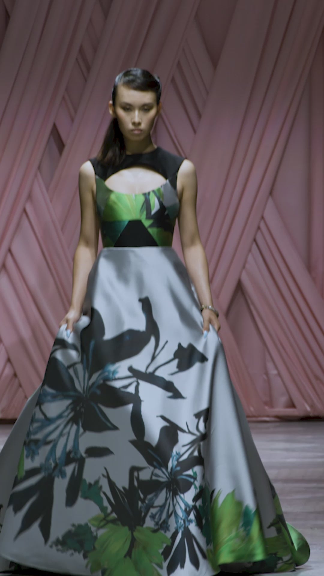 A full ball gown in silver Barathea fabric printed with the Lata motif. The fitted bodice extends into a voluminous skirt, creating a dramatic silhouette. The metallic print adds depth and shimmer to the structured design.