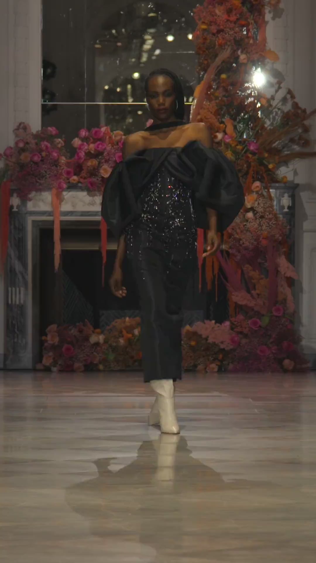 Command attention with the Sunburst Embroidered Black Faille Dress, a striking blend of bold design and intricate craftsmanship. The bodice is adorned with delicate sunburst embroidery, featuring orange, black, and silver dangling embellishments that create a captivating shimmer with every movement. A thin neck strap accentuates the neckline while the draped cloud sleeves add a soft yet bold sculptural element, contrasting beautifully with the sleek silhouette.