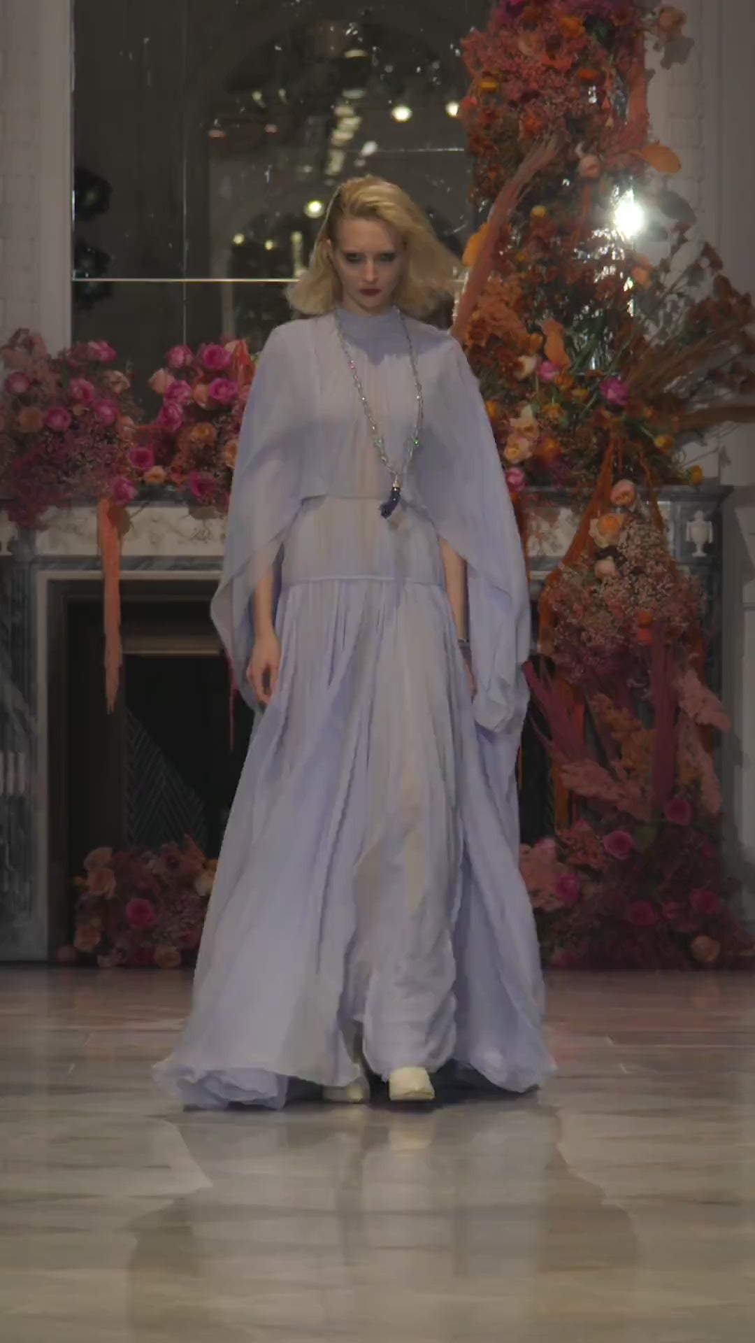 Tinted Aqua Chiffon Gown with Winged Cape and Draped Bodice